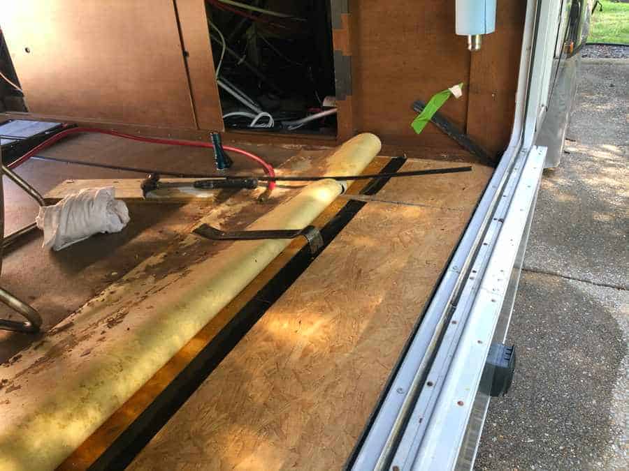 - I contacted Highland Ridge to see if I could get some design blueprints to understand what was beneath the subfloor. I needed to understand what was holding it in place and where the support beams were. They answered the bell and got me the design specs. After taking a look at the blueprints I proceeded to cut out a 4′ x 1′ section of the subflooring near the hatch. I could see why the wood was getting so wet. There very little protection where the edge of the plywood met the edge of the rig. A weatherstrip was installed but water could easily seep under the strip and penetrate the wood.