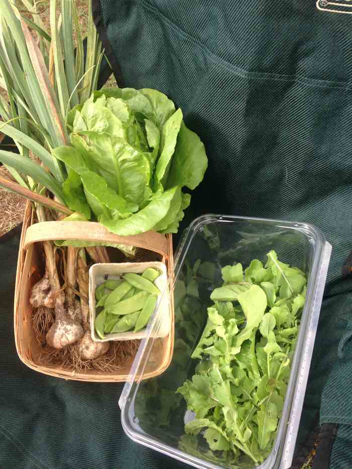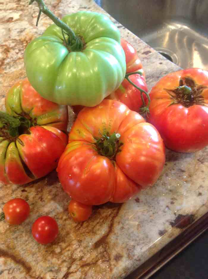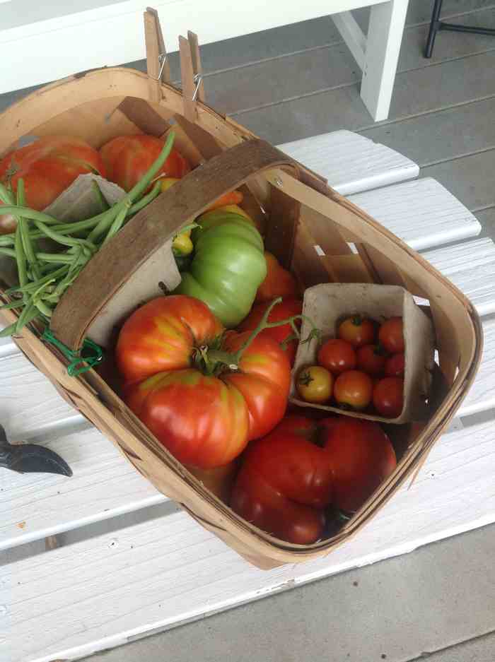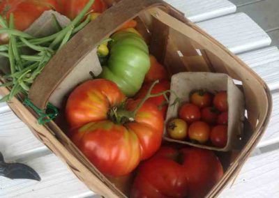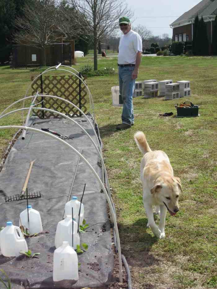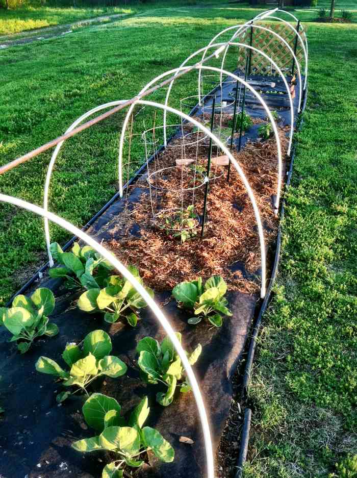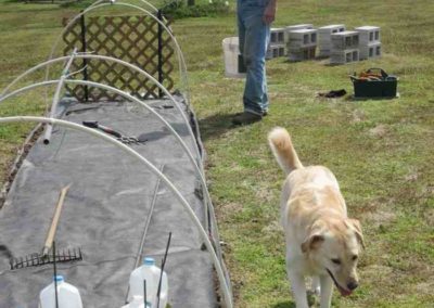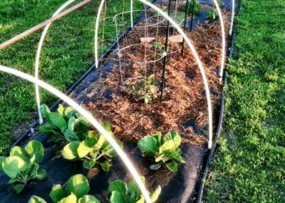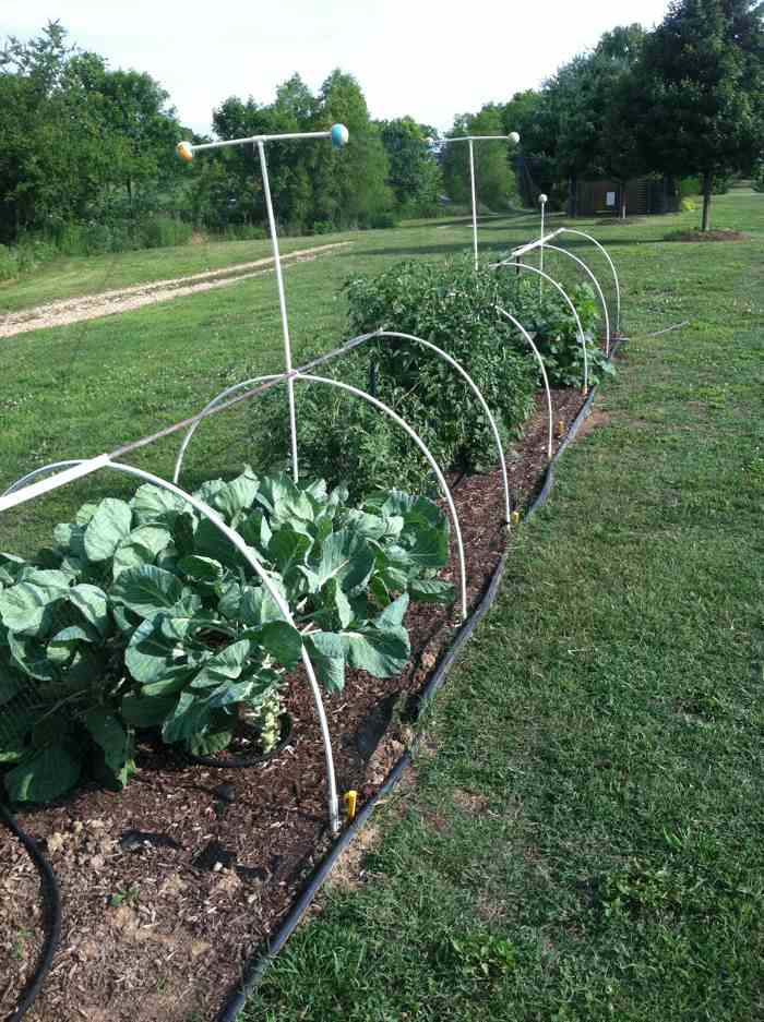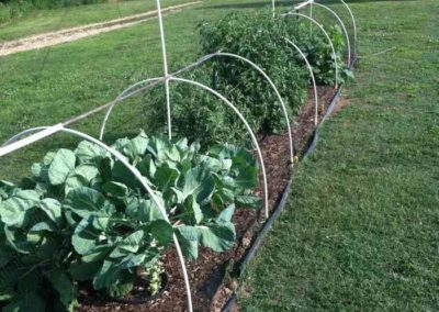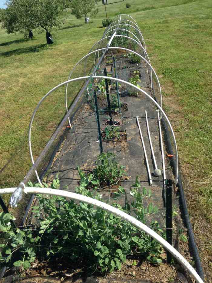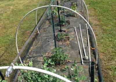 You’ll notice the hoop system I set up for the entire length of the garden. The local bird population got word that we had some very ripe and juicy tomatoes and such and began to peck away at our fruits. The rabbit population had the same idea when it came to our greens. I finally had to cover the entire garden in netting to keep them at bay.