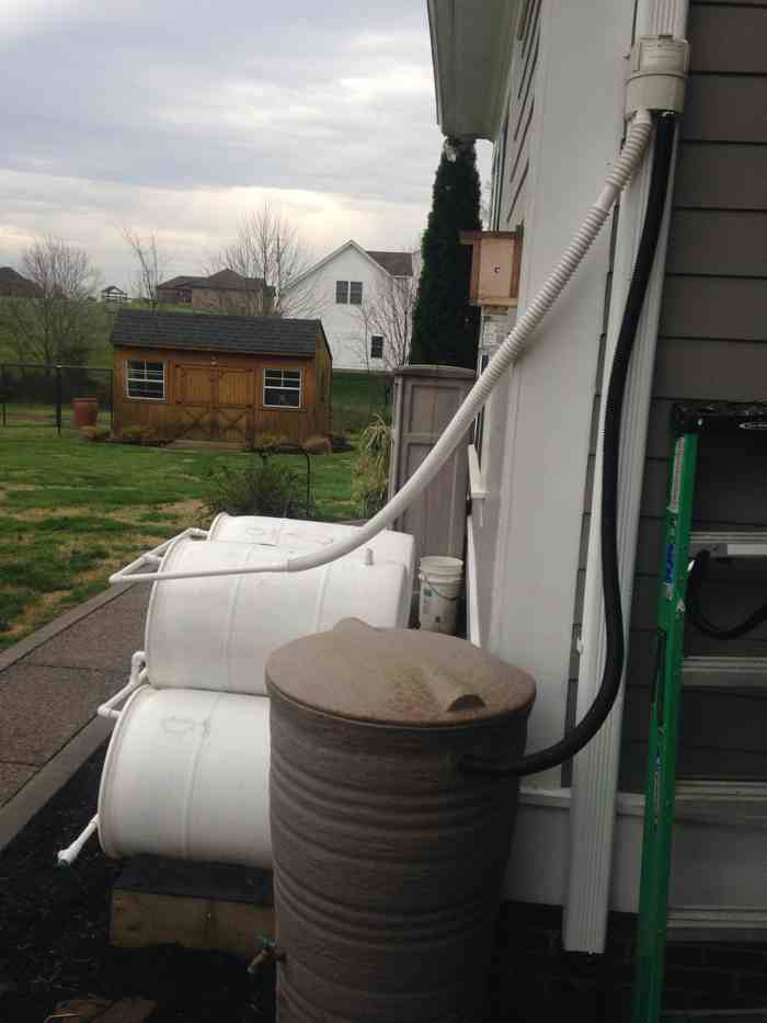 In an effort back in 2016 to supplement the water needed to keep the garden green I built this collection system. This featured five 50 gallon food-grade barrels interconnected with PVC piping and attached to the downspout.