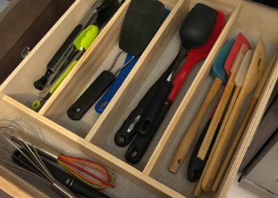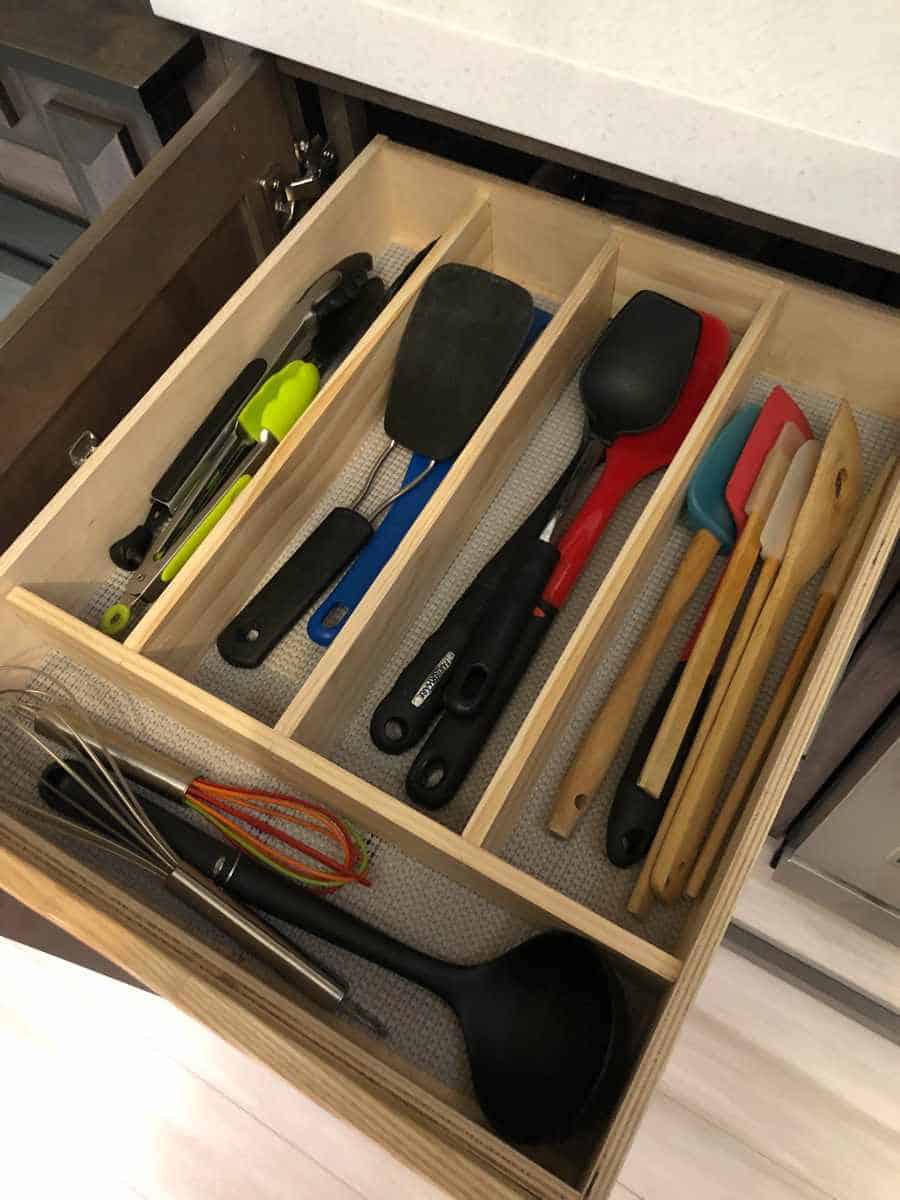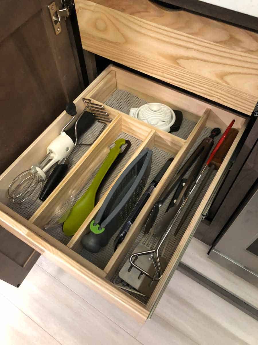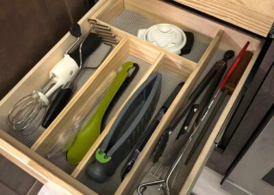 The age-old problem in most kitchens, you need dividers in the drawers to keep your stuff organized. No one likes to reach into a drawer only to find that you have to dig to the bottom to find what you need. On an RV this can be particularly frustrating as the “Stuff” gets put into the rough road blender and scattered in the drawers.