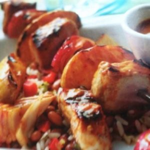 - Thread pork cubes onto 4 skewers, alternating pork, apple and onion wedges. About 6 pieces of pork per skewer.