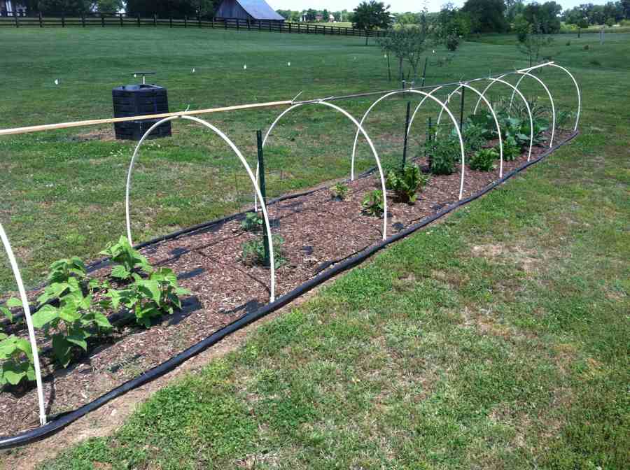 You notice the hoop system I set up for the entire length of the garden. The local bird population got word that we had some very ripe and tomatoes and such and began to peck away at our fruits. The rabbit population had the same idea when it came to our greens. I finally had to cover the entire garden in netting to keep them at bay.