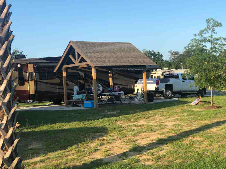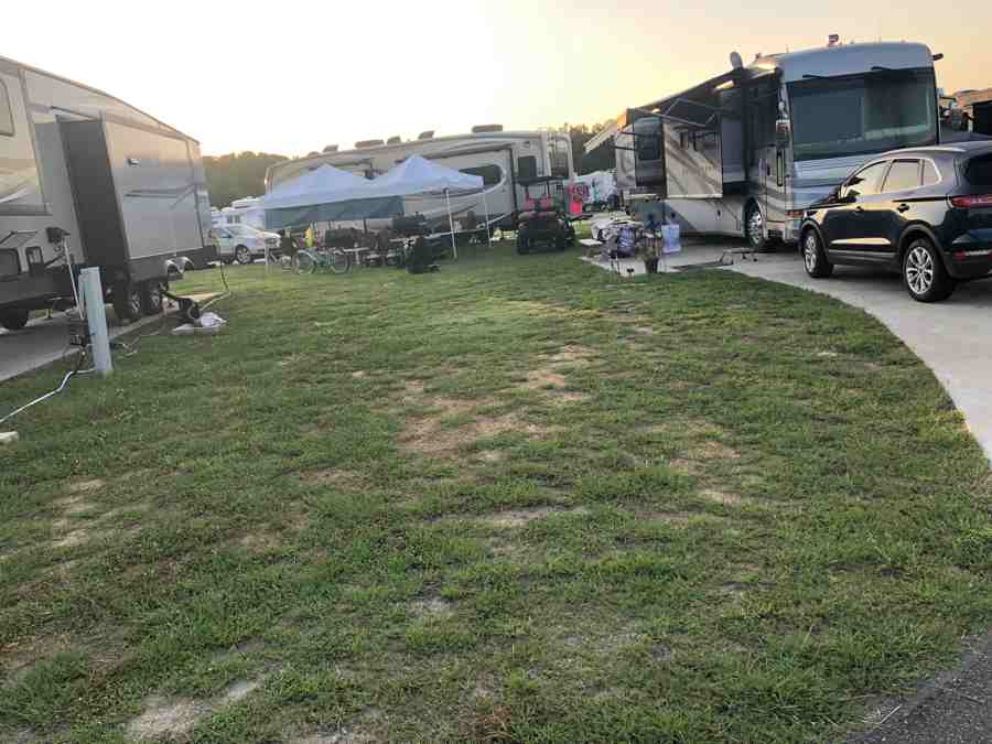 - The rest of the property consists of back-in sites. Most if not all have good green space between them. You will be butt to butt with the RV parked behind you. There is ample space to jack your rig into the spaces.