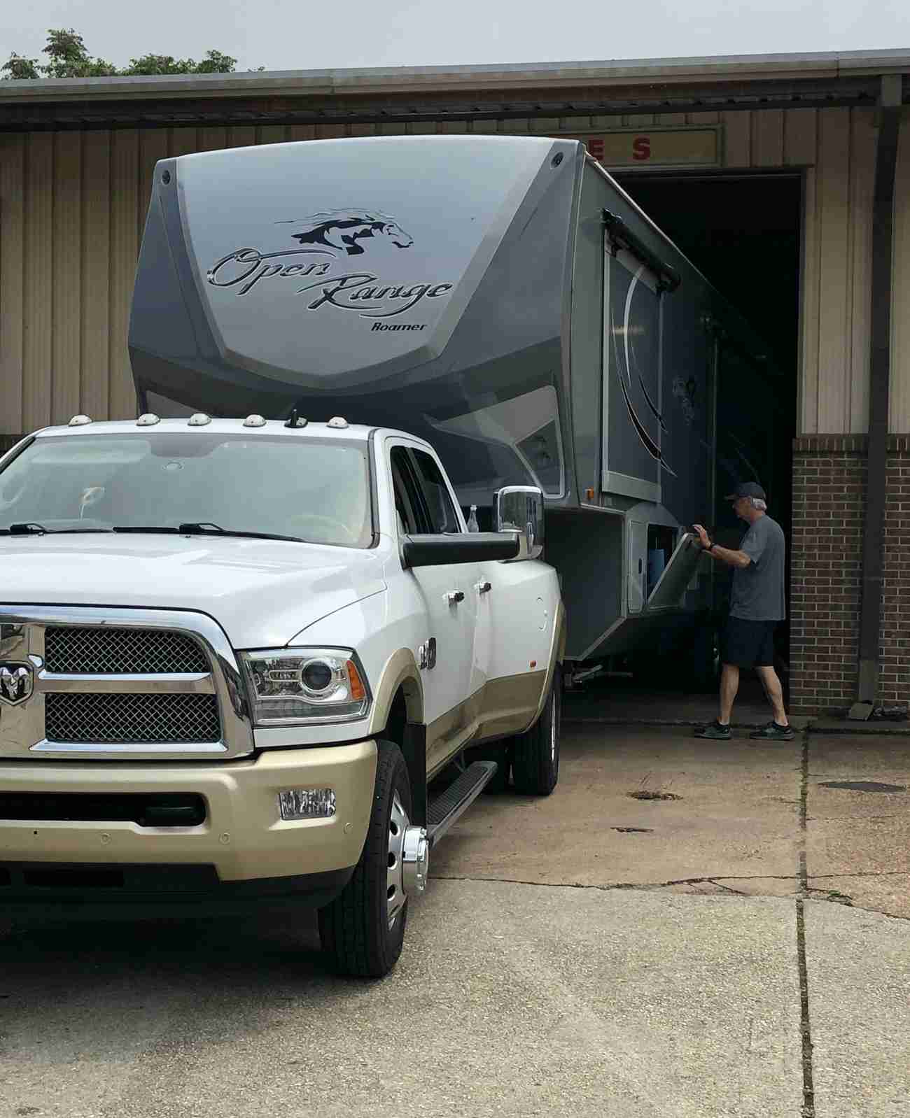 Let’s start with our current setup. The fifth wheel, Deloris is a 2021 Grand Design Solitude 310GK-R. Our previous RV Natasha was a 2017 Highland Ridge Open Range Roamer 347RES. We are towing with Boris, a 2016 RAM 3500 Laramie Longhorn Crew Cab 4×4 Long Box.