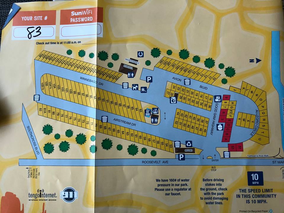 If you are ever near or plan a trip to Texas, San Antonio is a must stop. This RV Park Is a MUST STAY !!!! When we pulled into this location, there where about 7 RV’s in the waiting Q to check in at 1 pm. The check-in process went quickly and we headed to our pull through site right next to the pool. They did not guide us to our spot and frankly, the maps they provide are a bit difficult to read. You can get a bit turned around and in a spot, you don’t want to be. Beyond that, as I looked around the facility it was tidy and spotless. This pull-through site was level and manicured nicely. We have a concrete pad extending the entire length of the rig, no need for our sand mats which was a god sent. The picnic tables are new with umbrella holes but no stands. The pads were such that I could have used the tie down’s for the awning if needed. We were located right next to the pool and that put us across the road from the laundry, dog walk, and bathhouse. This location has it all, work out facility, yoga area, a dog area that is carpeted, very clean laundry and bathhouse. Just a few 100 yards away is the River Walk. This is an 11-mile walk along the Guadalupe River. Picnic tables, bike rentals, parks, access to the Missions….just a very special walking and riding area. As for access, you will need to follow the directions that are provided by the resort and ditch your GPS. There are low bridges and a railroad track that you will not want to run into. I will get into a rundown of San Antonio in another post, it is a gem. For now, this is a ⛺️ ⛺️ ⛺️ ⛺️ ⛺️ location….we would come back in an instant