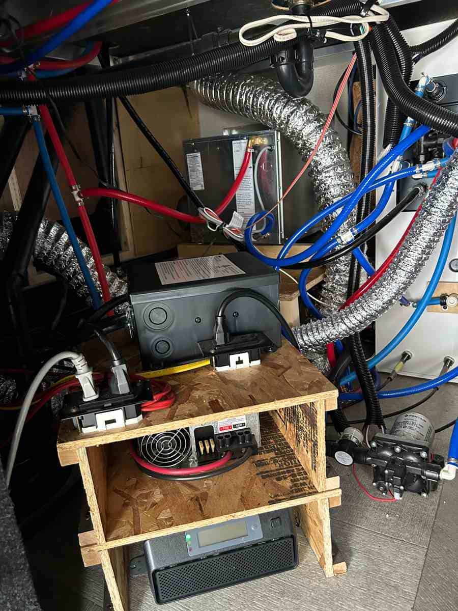 Taking out the old Suburban 12gal was not an issue. However, the Truma is a much smaller unit and requires the correct access door plate to cover the larger hole. Beyond that minor modifications involved moving the gas line from the left to the right of the unit and building support for the rear of the heater. This is a 12volt/gas unit, you will not need the 120volt connected to your previous tank. That was tied off for a future project I have in mind. We tied the power to the existing 12-volt Electric switch on the interior board. Snaking the communication wire/switch to the cabinet was easy and I had plenty of room on the front side near the inverter switch.