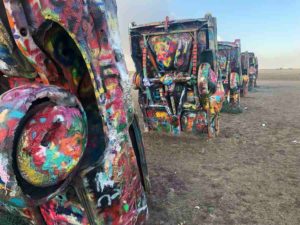 Cadillac Ranch – 13651 I-40 Frontage Rd, Amarillo, TX 79124 is a public art installation and sculpture in Amarillo, Texas, USA. It was created in 1974 by Chip Lord, Hudson Marquez, and Doug Michels, who were a part of the art group Ant Farm. The installation half-buried ten Cadillacs nose-first in the ground
